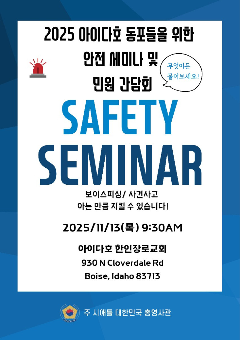2025년 4분기 아이다호 순회영사계기 아래와 같이 안전세미나 및 민원 간담회를 실시코자 하오니, 아이다호주에 거주하시는 재외동포분들의 적극적인 참여 부탁드립니다.